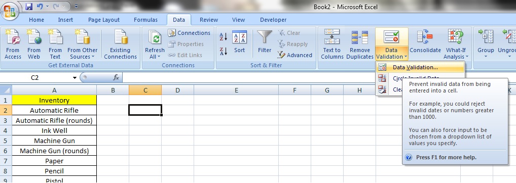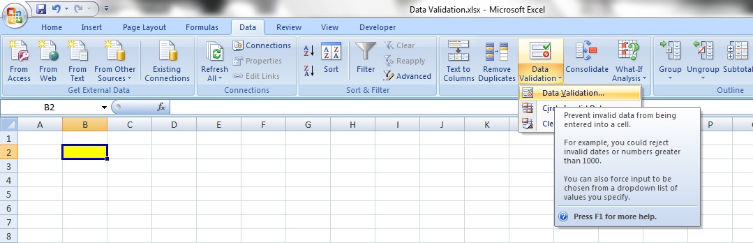 Go to the ‘Data’ tab and select ‘Data Validation’ – a drop down arrow will show 3 options – select ‘Data Validation’ once again.