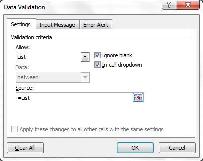 Now, in the ‘Source’ field, type in =List. Recall that we named our reference list as ‘List’. We are referring to it here! Now, click ‘OK’.