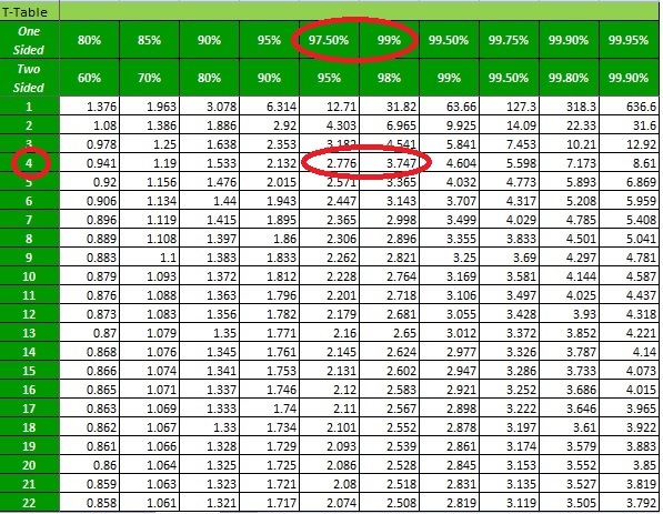 We compare the T-statistic with the degrees of freedom (that is just a fancy way of saying the total number of samples -1. In our case, 5-1 = 4) and then get the probability percentage, which is between 2.5% (100% – 97.50%) – 1% (100% – 99%).