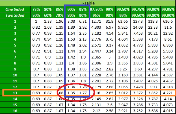 Compare the T-statistic with the T-table. Looking at this table, we get our degrees of freedom, or df, by subtracting 2 from 5+10 = 13. Now, we will find our T-statistic on this table.