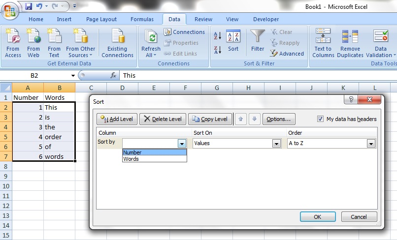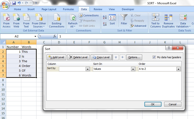 ‘Add Level’ will add an additional aspect of sorting. Meaning, that the data will be sorted by one set of data, before moving on to the next one specified. In this case, the data will be sorted by the ‘Numbers’ column and then the ‘Words’ column.
